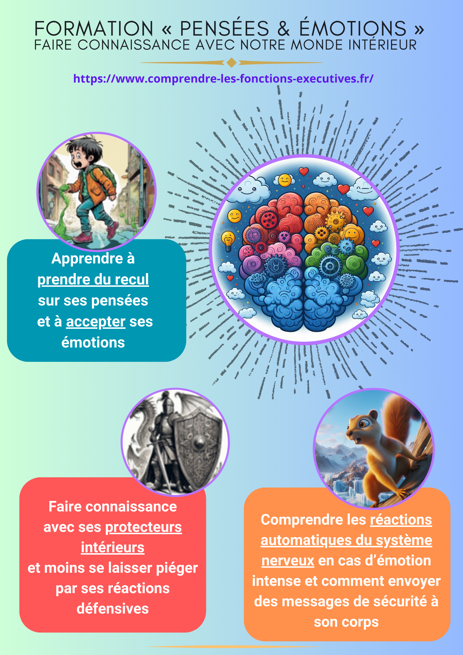 La formation « Pensées & Émotions : faire connaissance avec notre monde intérieur » - version Professionnels propose de nombreux outils visuels pour guider l’enfant et ses parents à mieux comprendre le fonctionnement de leurs pensées et de leurs émotions. L’ensemble des vidéos, quizz et outils de réflexion pour enfants, adolescents et parents sont mis à disposition. Des points théoriques sont proposés afin d’expliquer cette approche novatrice qui combine 3 axes issus de la Thérapie ACT (thérapie d'acceptation et d'engagement), de la Thérapie IFS (thérapie des systèmes familiaux intérieurs) et de la Théorie Polyvagale.